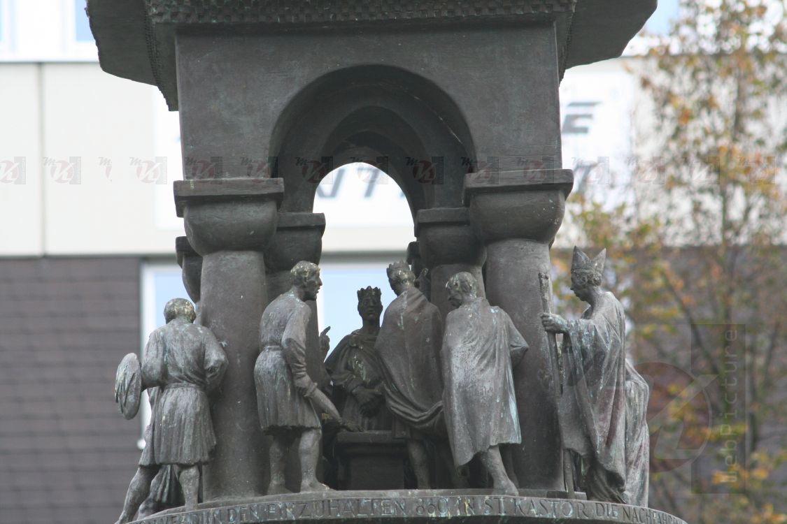 Die auf dem Görresplatz befindliche Säule ist ein Brunnen, der im unteren Teil aus einem Boot mit Ruderern besteht.